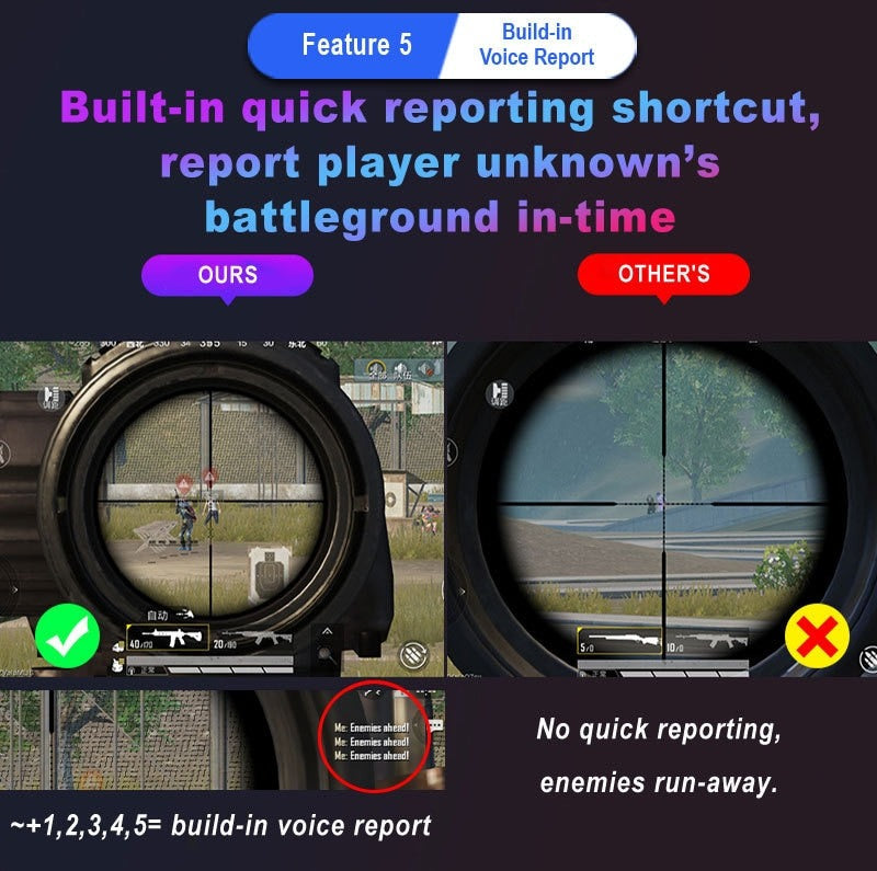 1、BT5.0 connection, stable signal, not occupy charging port or headphone port, convenient to use. 2、Adopt cloud key mapping technology, default key mapping auto-match, support a variety of phone models. 3、Built-in quick reporting shortcut, report player unknown\u0027s battleground in real time.